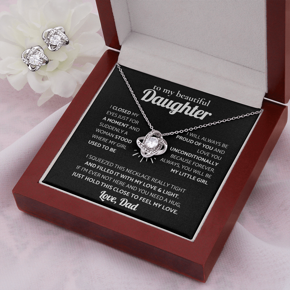 Heartfelt Message: To My Beautiful Daughter. I closed my eyes just for a moment and suddenly a woman stood where my girl used to be. I will always be proud of you and love you unconditionally because forever, always, you will be my little girl. I squeezed this necklace really tight and filled it with my love & light. If I’m ever not here and you need a hug, just hold this close to feel my love. LOVE, DAD