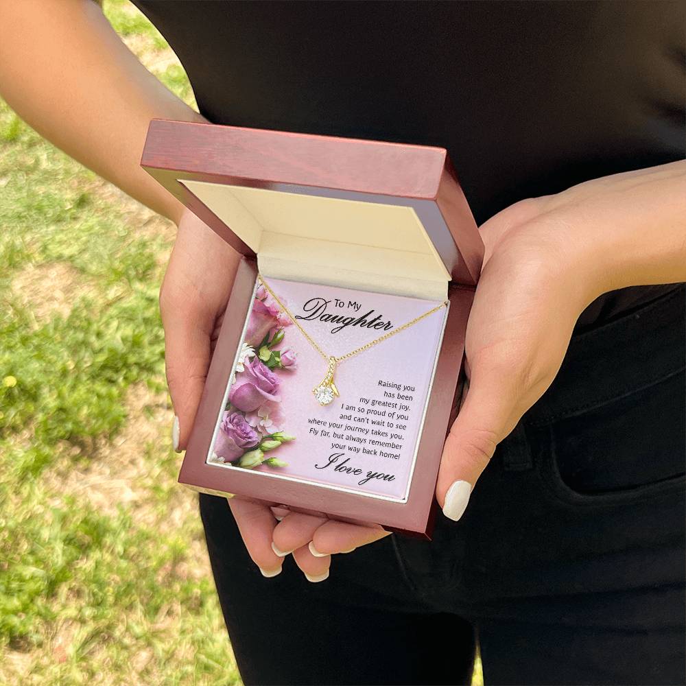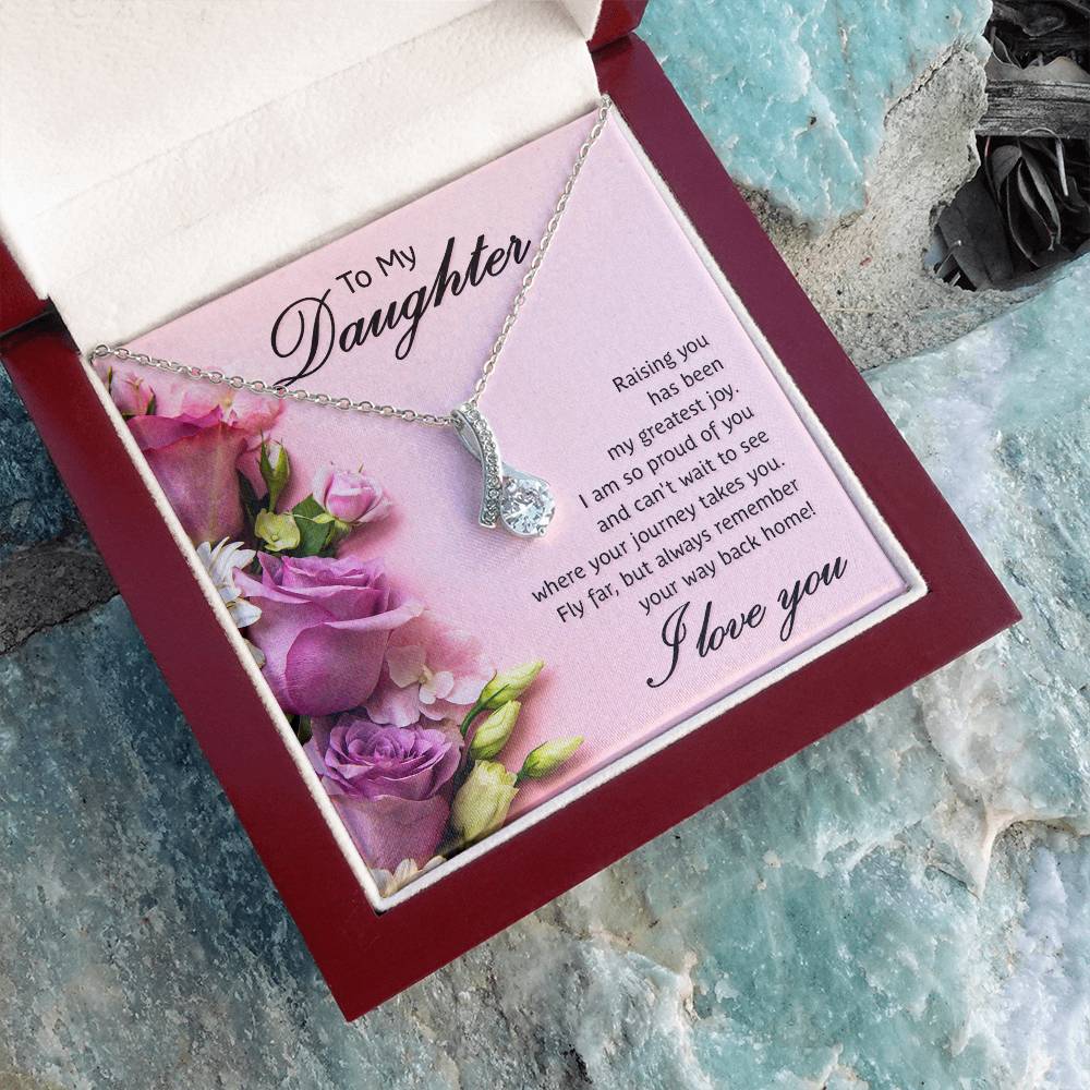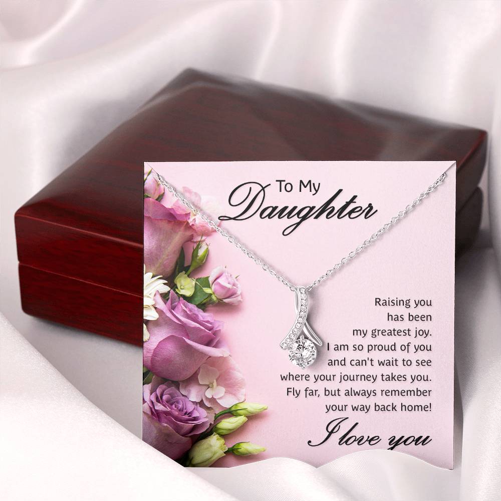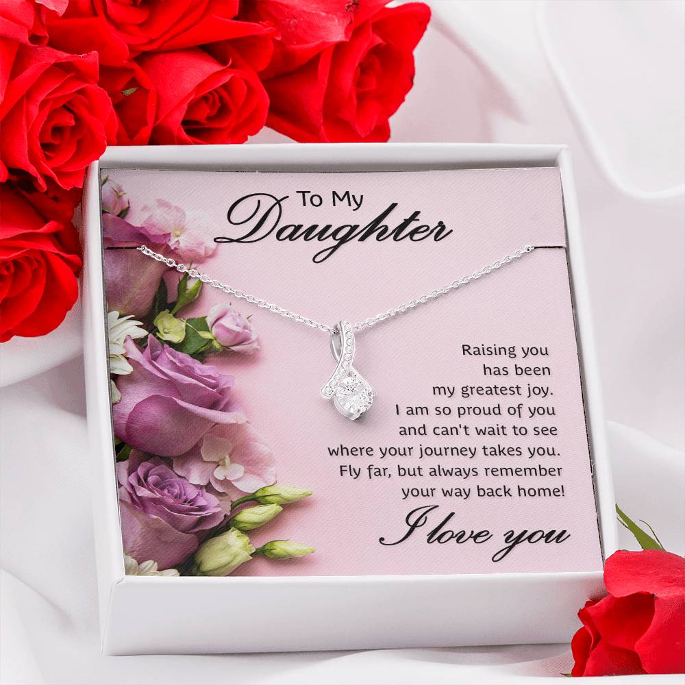 Imagine her reaction when she opens this stunning gift! The Ruban Twist Daughter Necklace features a petite ribbon shaped pendant that is sure to dazzle your special someone. Whether it's a birthday or anniversary, make sure to get her a gift she will love for years to come.