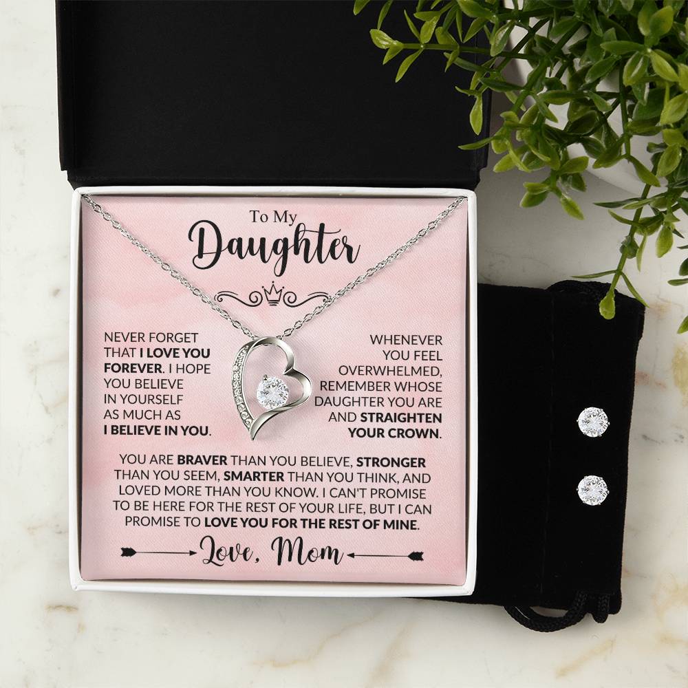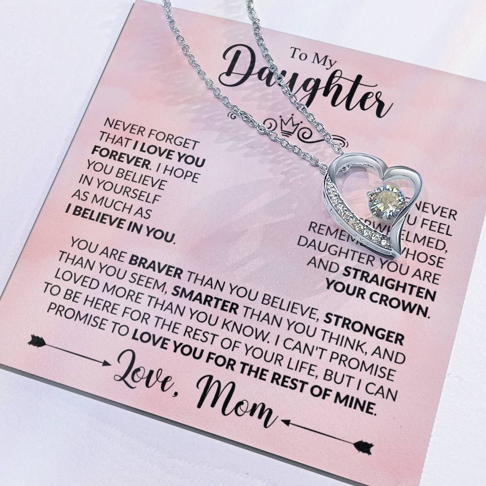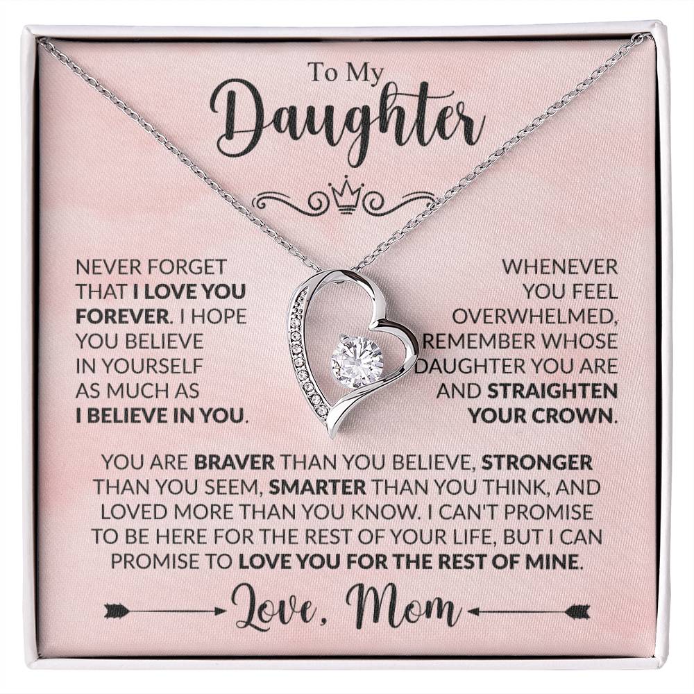 Heartfelt Message: To My Daughter, Never forget that I love you forever. I hope you believe in yourself as much as I believe in you. Whenever you feel overwhelmed, remember whose daughter you are and straighten your crown. You are braver than you believe, stronger than you seem, smarter than you think, and loved more than you know. I can't promise to be here for the rest of your life, but I can promise to love you for the rest of mine. Love, Mom
