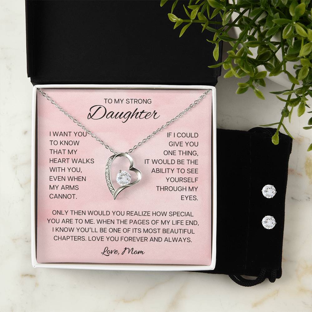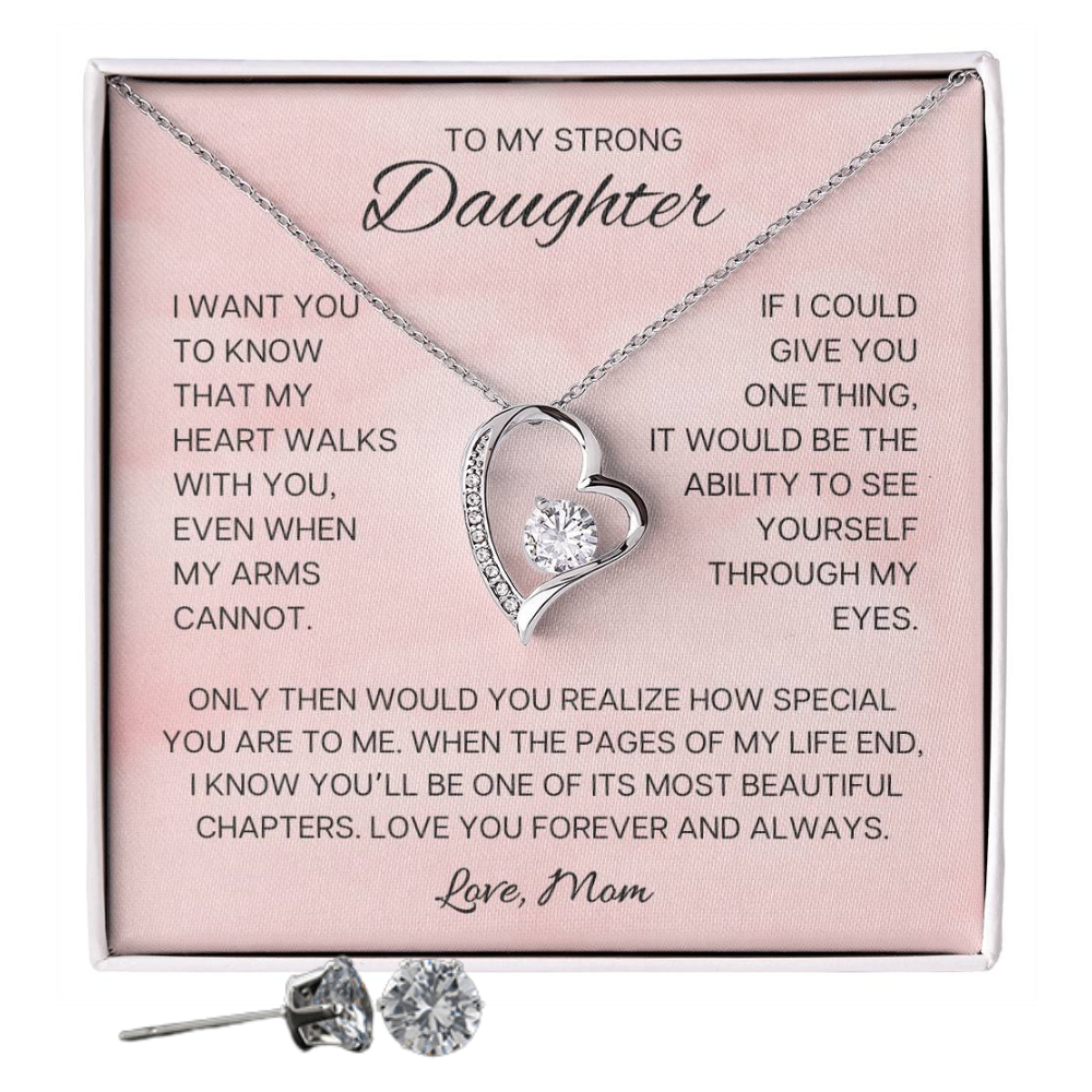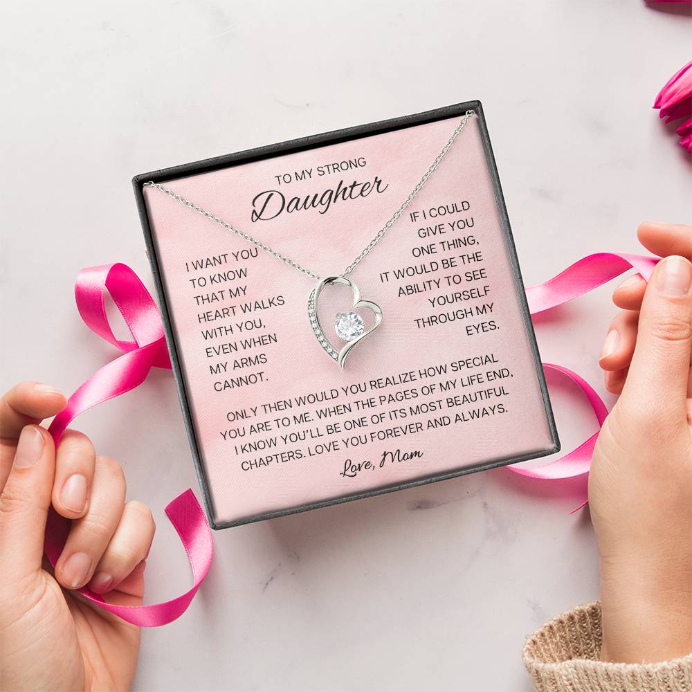 Heartfelt Message: To My Strong Daughter, I want you to know that my heart walks with you, even when my arms cannot. If I could give you one thing, it would be the ability to see yourself through my eyes. Only then would you realize how special you are to me. When the pages of my life end, I know you'll be one of its most beautiful chapters. Love you forever & always. Love, mom