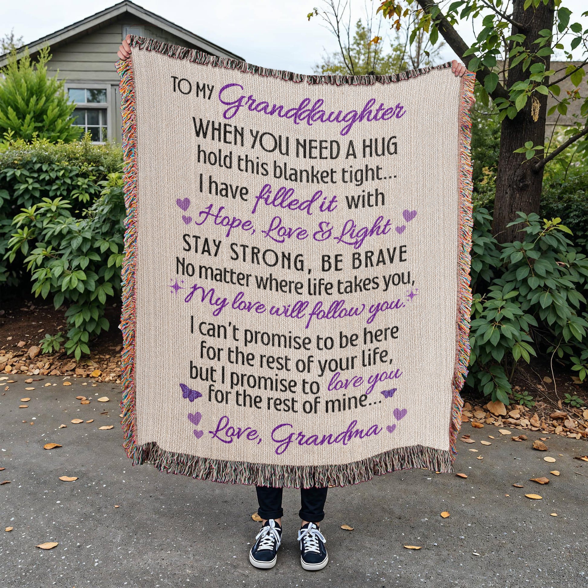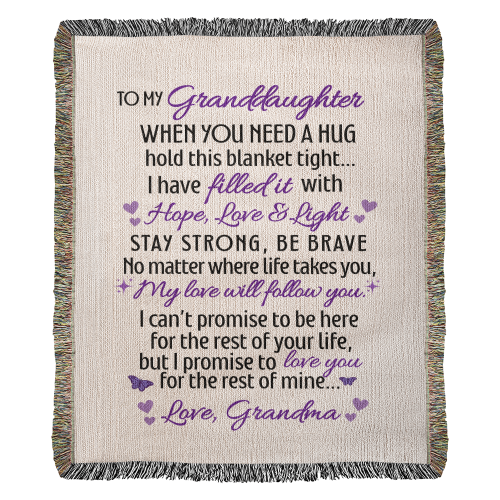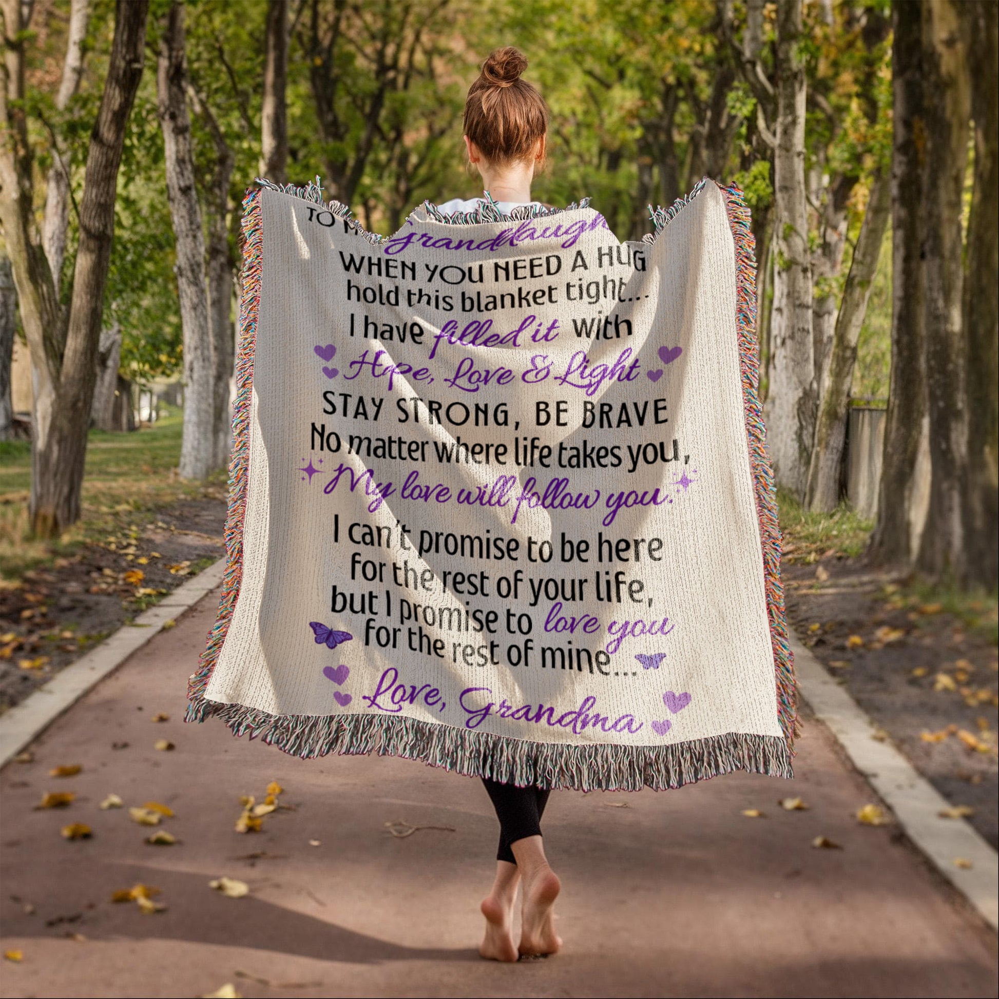 ''When you need a hug, hold this blanket tight. I filled it with Hope, Love & Light. STAY STRONG, BE BRAVE. No matter where life takes you, my love will follow you. I can’t promise to be here for the rest of your life, but I promise to love you for the rest of mine. Love, Grandma''