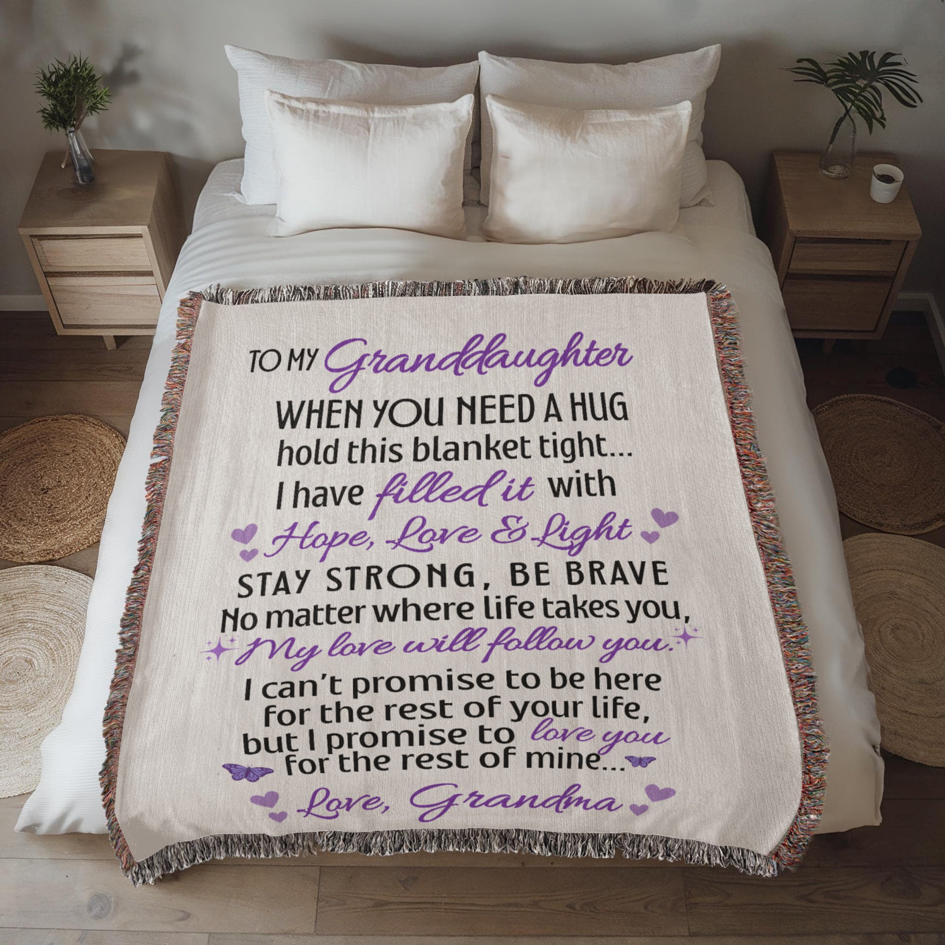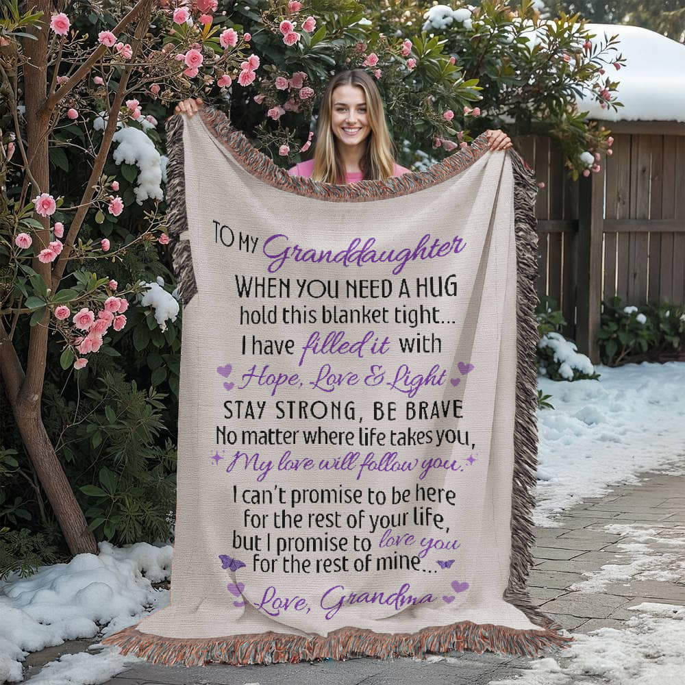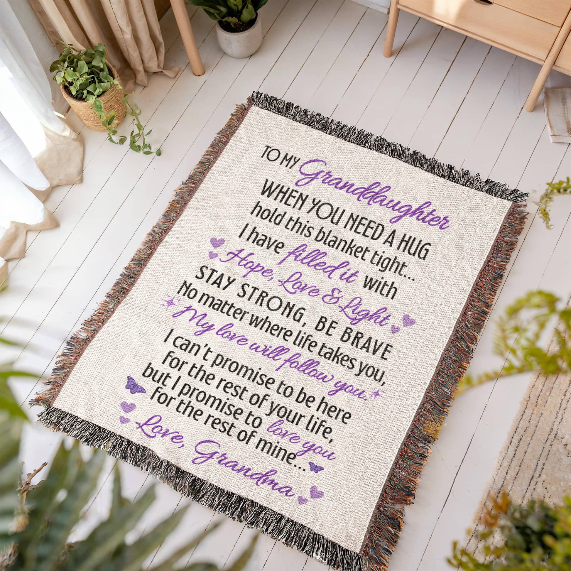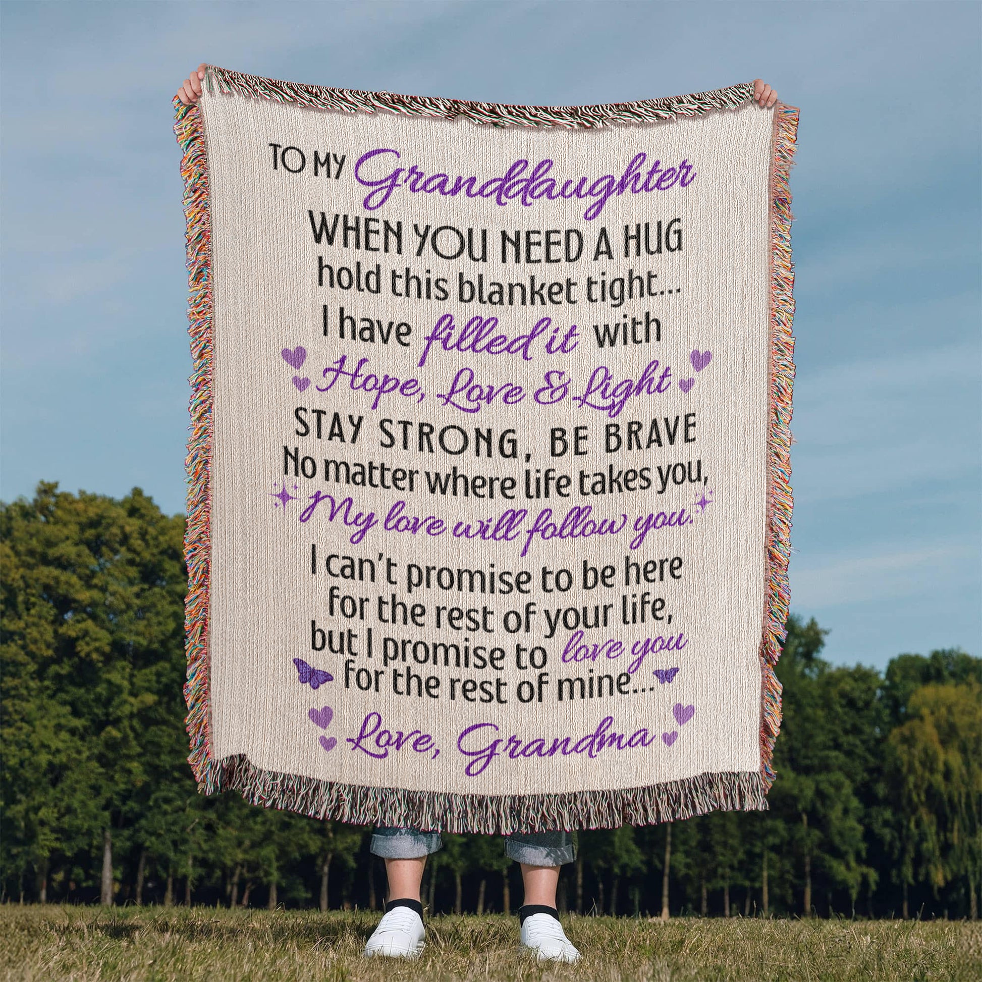 ''When you need a hug, hold this blanket tight. I filled it with Hope, Love & Light. STAY STRONG, BE BRAVE. No matter where life takes you, my love will follow you. I can’t promise to be here for the rest of your life, but I promise to love you for the rest of mine. Love, Grandma''
