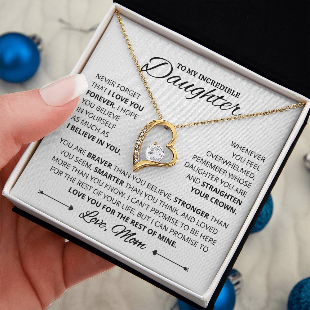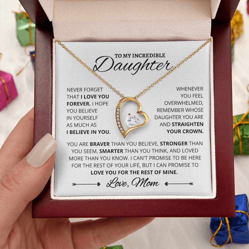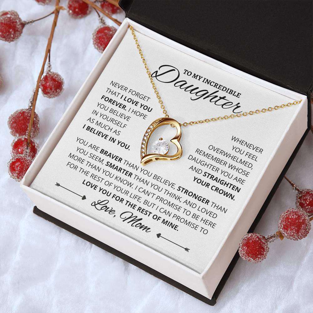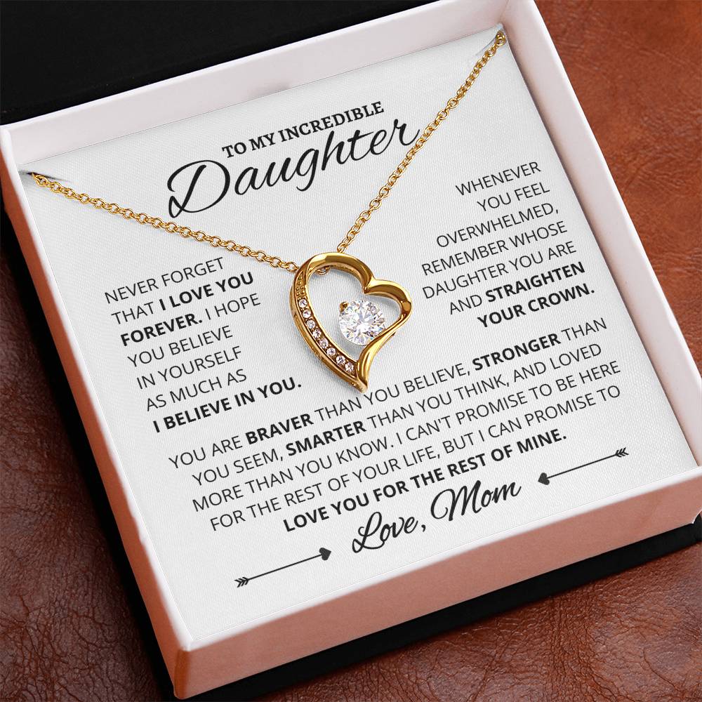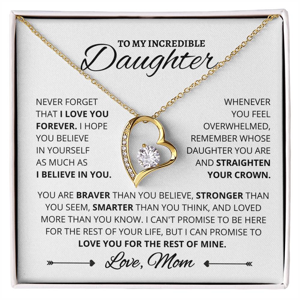 Heartfelt Message: To My Daughter, Never forget that I love you forever. I hope you believe in yourself as much as I believe in you. Whenever you feel overwhelmed, remember whose daughter you are and straighten your crown. You are braver than you believe, stronger than you seem, smarter than you think, and loved more than you know. I can't promise to be here for the rest of your life, but I can promise to love you for the rest of mine. Love, Mom