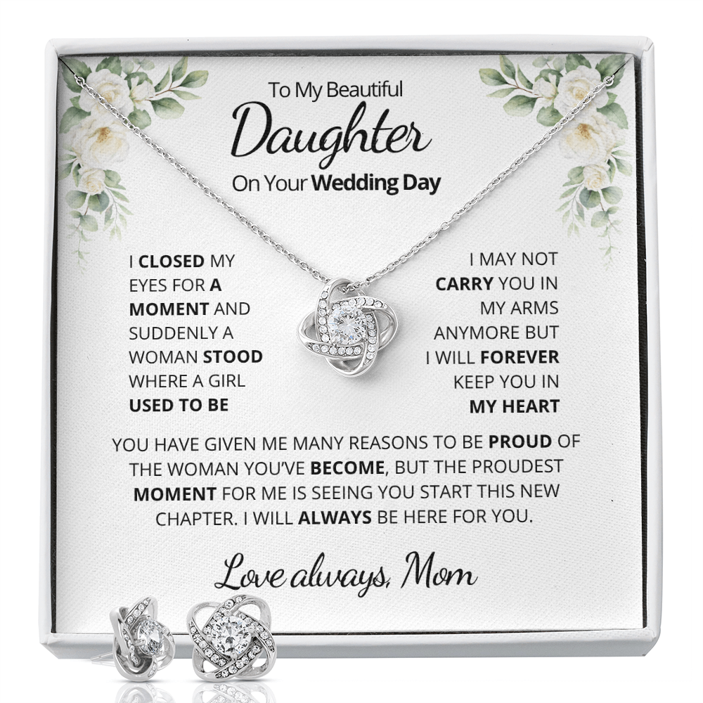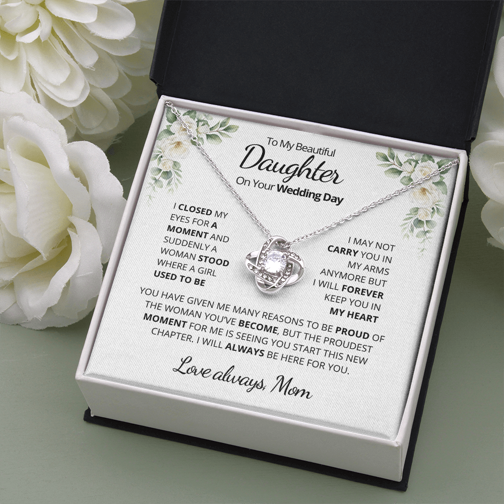 Heartfelt Message: To My Daughter... on your wedding day. I closed my eyes for just a moment and suddenly a woman stood where a girl used to be. I may not carry you in my arms anymore but I will forever keep you in my heart. You have given me many reasons to be proud of the woman you’ve become, but the proudest moment for me is seeing you start this new chapter. I will always be here for you. Love always, Mom